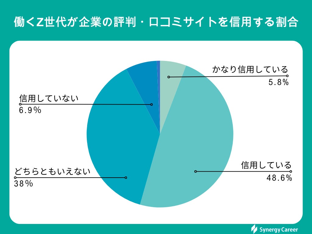 働いている会社がホワイト企業だと実感してる割合や「評判口コミサイト」を信用している割合など:https://synergy-career.co.jp/media/zsedai-whitekigyou/
