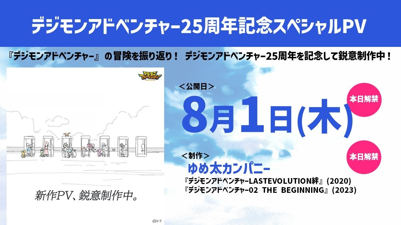 そして、デジモンアドベンチャー25周年を記念して鋭意制作中の「デジモンアドベンチャー25周年記念スペシャルPV」の解禁日も8月1日に決定しました!本PVの制作を担当するのは劇場版『デジモンアドベンチャーLASTEVOLUTION絆』『デジモンアドベンチャー 02 THE BEGINNING』を制作したゆめ太カンパニーとなります。新規作画でTVアニメ『デジモンアドベンチャー』の冒険を振り返ることのできる本PVはYouTubeのデジモンパートナーズ公式チャンネルでも公開予定となります。