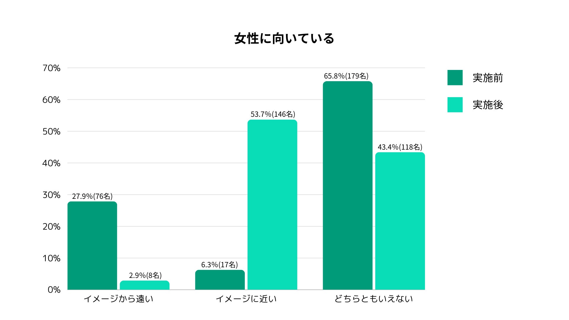特に、「女性に向いている」(約9倍増加)、「親しみやすい」(約4倍増加)の2項目で大幅なイメージの改善が見られた。