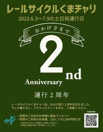 このたび、サービス開始から2周年を迎え、「レールサイクル『くまチャリ』 2周年ありがとうキャンペーン」を7月9日(日)までの土日祝の運行日に実施しています。