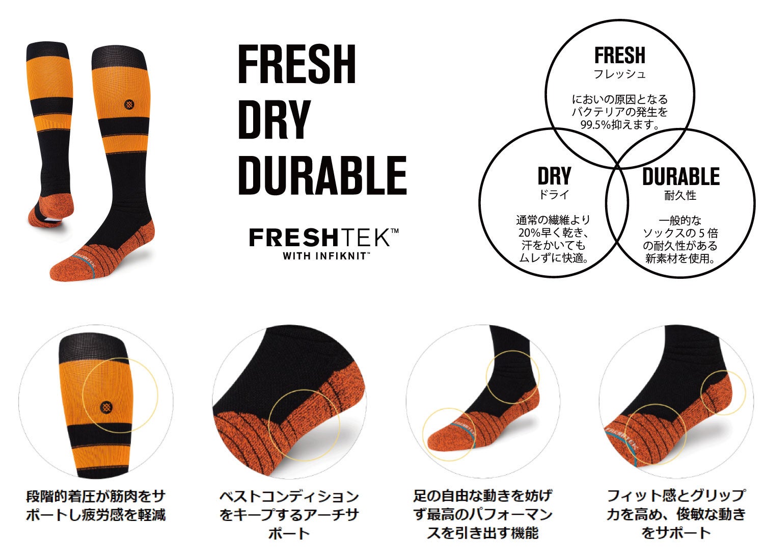 ギア的な要素とファッションを兼ね備えた新時代のソックスとしてメジャーリーグ(MLB)全30球団が公式採用し、多くのプレーヤーの足元を支えています。