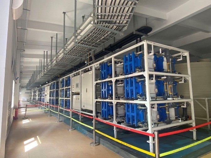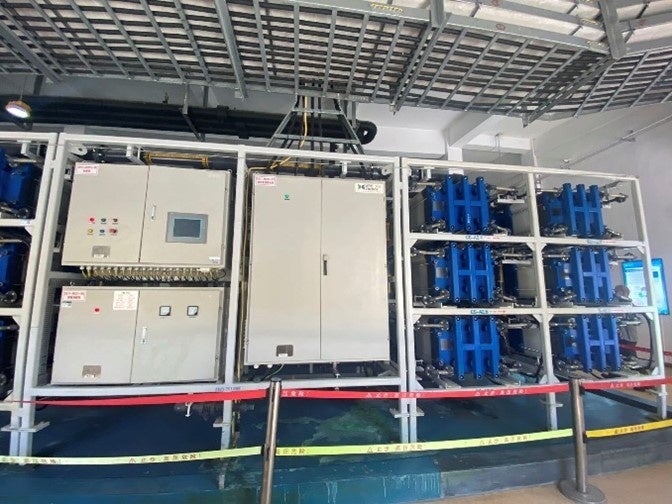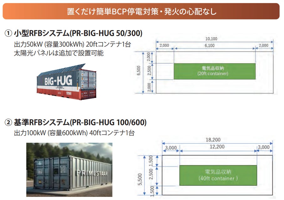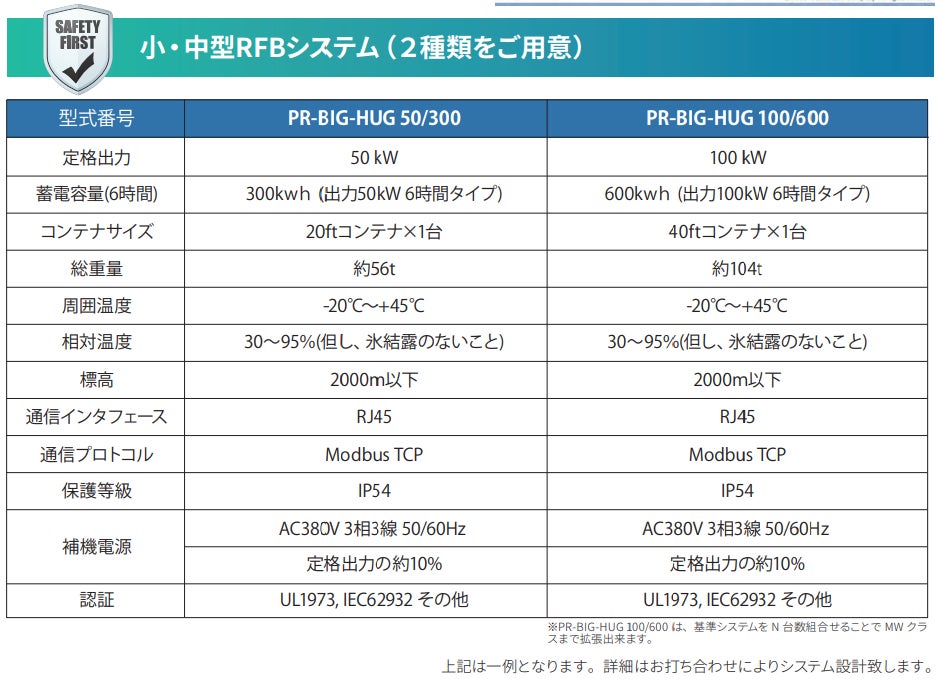 消耗品は、イオン交換膜(IEM)・パワーコンディショナーシステム(PCS)・そして、換気システム(INV)・循環ポンプなど一部の電気部品のみとなります。また、レドックス・フロー蓄電池は、セルと電解液を分離して設置することができます。充電した電解液を密閉容器に保存することで、低コストで長期間の電力貯蔵が可能となります。このように、レドックス・フロー蓄電池は、安全性と寿命などにおける優位性を持っています。今回、比較的コンパクトなサイズとし、分散設置をすることにより、