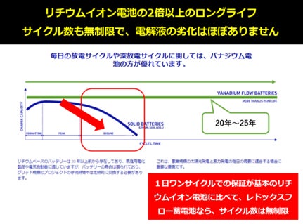 電解液の充放電サイクルは無制限と、リチウムイオン電池に比較して長期運用が可能なため、総合的な