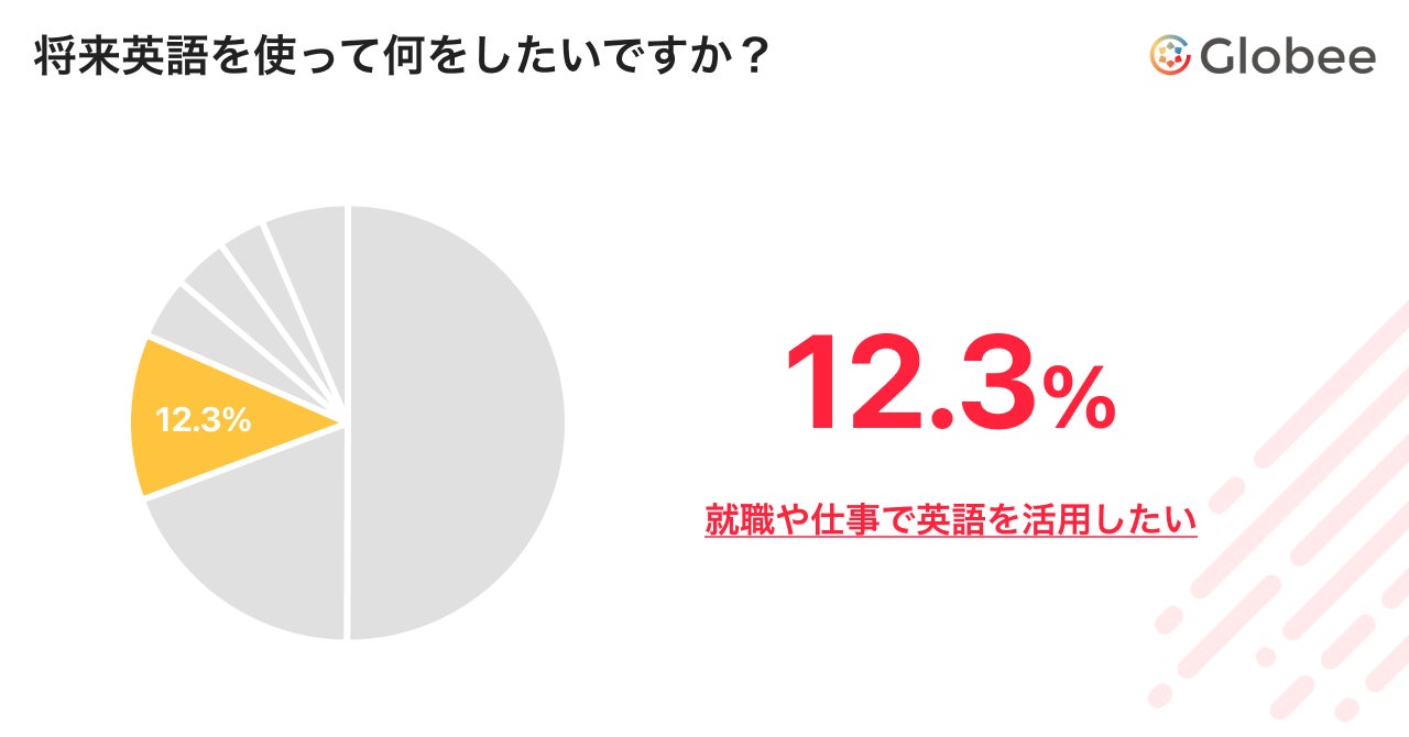 | ・外国人とコミュニケーションを取りたい(外国人の友人が欲しい/世界の人と話してみたい)50.1% ・海外旅行・留学・移住をした際に自分の言葉で喋りたい 19.2% ・就職を有利にしたい・将来の年収を上げたい 12.3% ・まだ決まっていない 4.6% ・海外ドラマ・映画・YouTubeを字幕なしで観たい4.0% ・海外の本・漫画・論文を読みたい3.4% ・その他(洋楽を歌いたい /英語ができることを自慢したい/日本伝統を伝えていきたい/海外ボランティアの為etc.)6.4% |