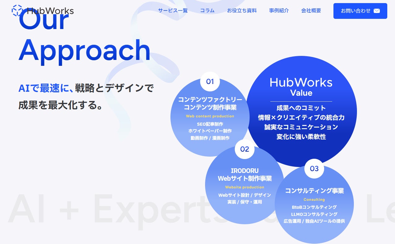 今回のリニューアルでは、HubWorksがこれまで培ってきたBtoBマーケティング支援の強みや、AI活用と専門人材による支援体制について、より分かりやすく伝える構成へ変更しました。
