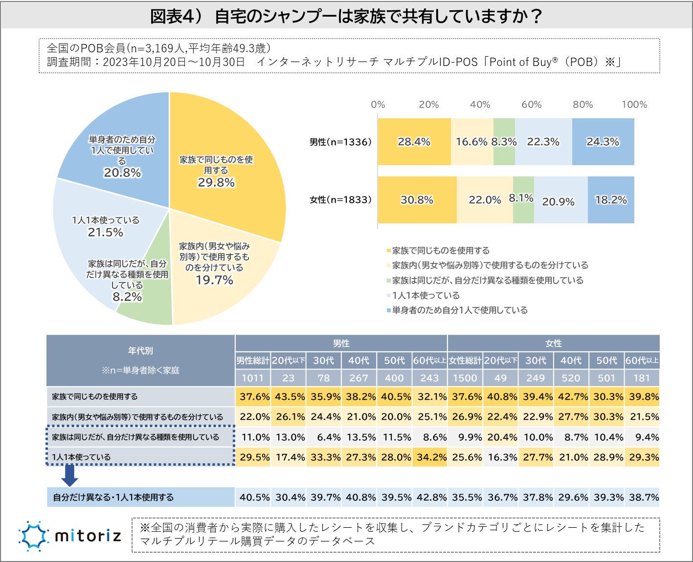 「家族は同じだが、自分だけ異なる種類を使用している」「1人1本使っている」を合わせた29.7%の人が家庭内で自分専用のシャンプーを使っていることがわかりました。単身者を除き年代別をみると男性の方が年代を増すごとに「自分だけ異なる種類を使用する」「1人1本使用する」の比率が高くなっています。女性は男性と比べて家族内でシャンプーを共有して使用している傾向がありそうです(図表4)。