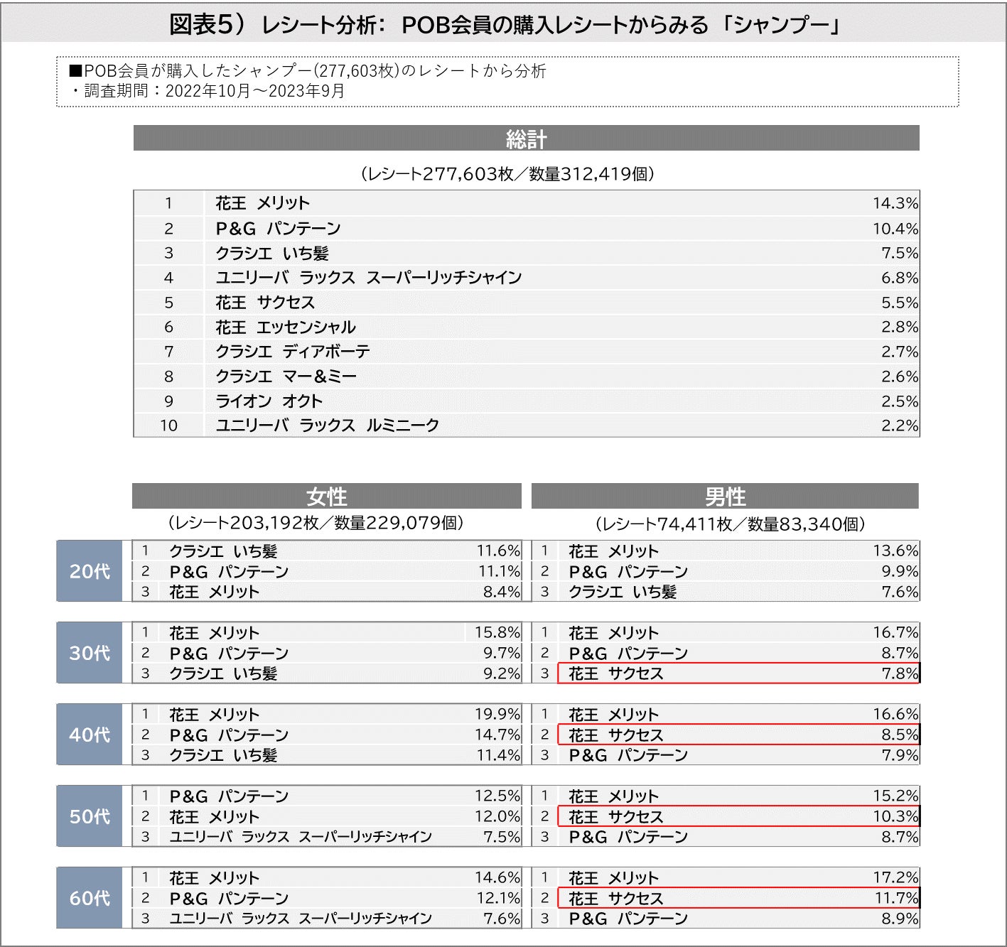 POB会員の投稿レシートデータから同カテゴリの商品ブランドの構成比をあらわしたものです(調査期間:2022年10月~2023年9月、レシート合計277,603枚)。1位は「花王 メリット(14.3 %)」、2位「P&G パンテーン(10.4%)」、3位「クラシエ いち髪(7.5%)」が上位に続きました。王道商品が続くも、2022年に発売された「クラシエ マー&ミー」が8位にランクインしています。