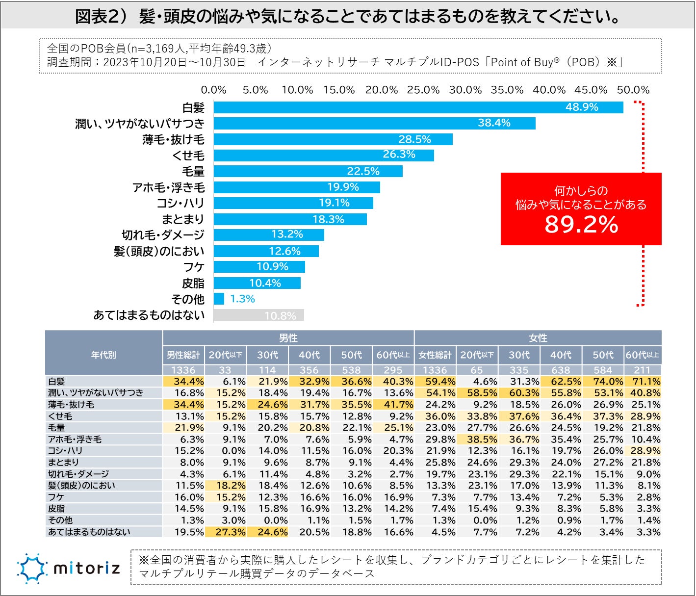 髪の悩みは「白髪」が5割で最も多く、女性は年代を問わず「くせ毛」「髪の潤い」の悩みも上位に