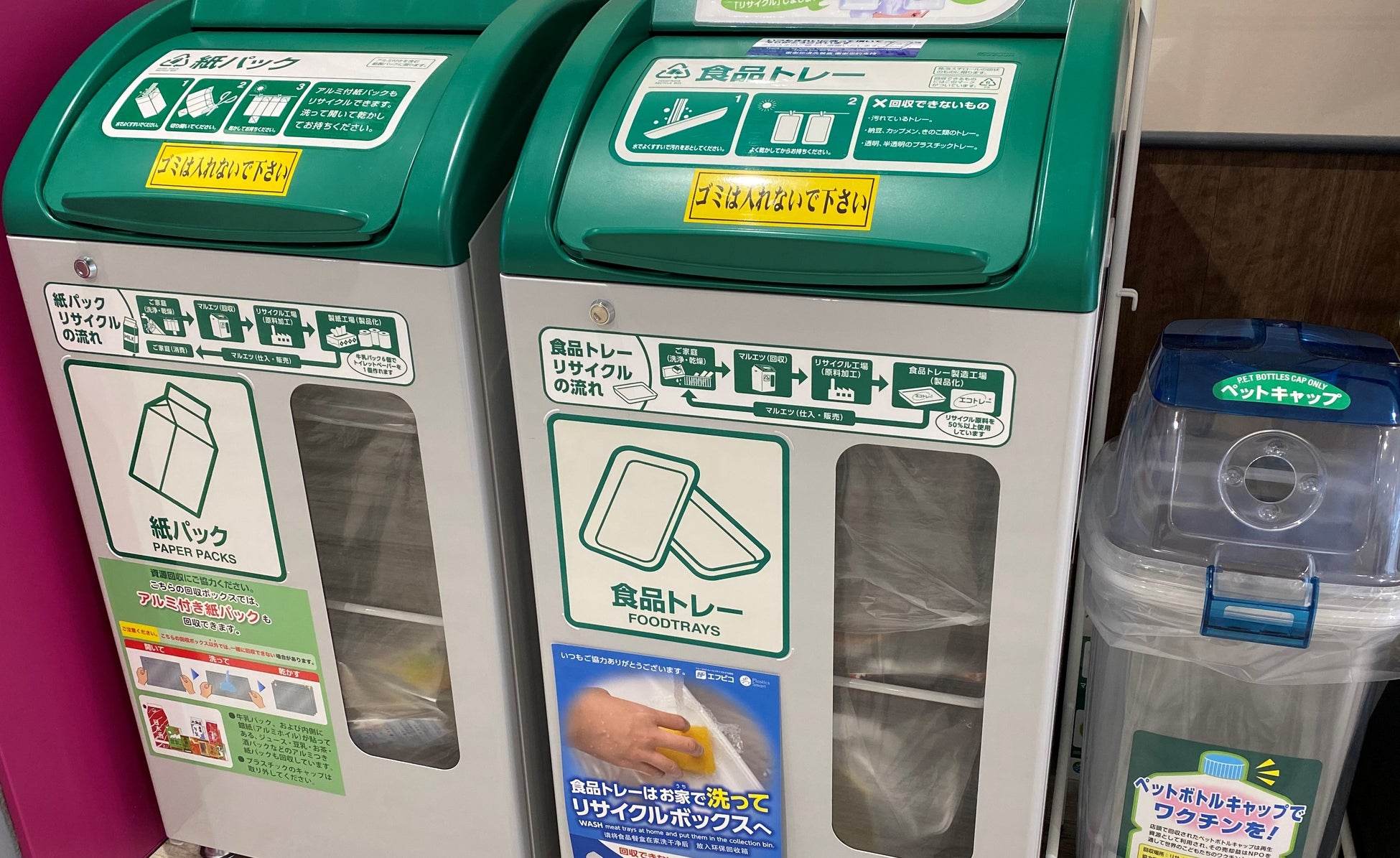 再生可能資源のリサイクルを促進するため、ほぼ全店の店頭にリサイクルボックスを設置し、食品トレイや紙パックなどを回収