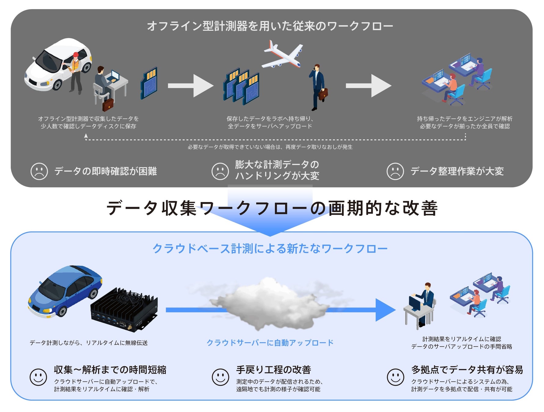 従来の計測ワークフローでは、目的に応じた複数の計測機器を使ってデータをデータディスクに保存し、計測終了後にそれらを回収していました。また、テストエンジニアが所有するPCへデータをコピーした後、ログ開始タイミングを合わせるなど、解析利用の為にデータの手直しをする必要がありました。