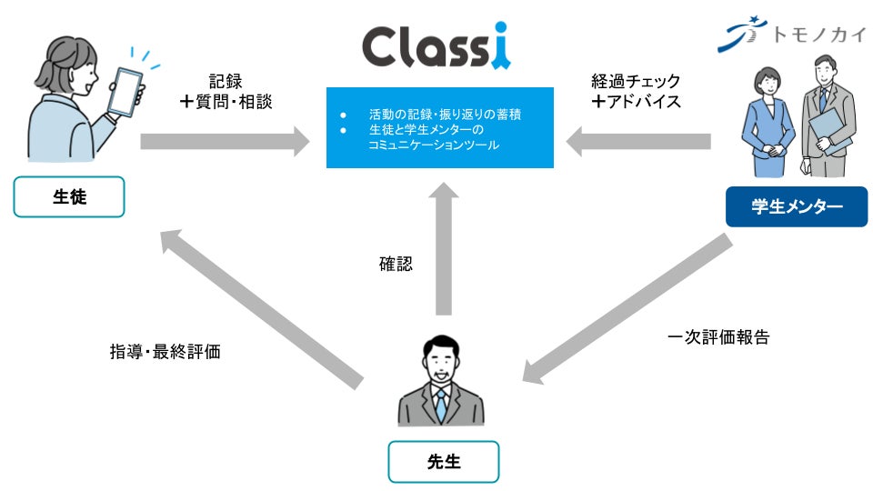 トモノカイが派遣する学生メンターはこれまでも、「Classi(クラッシー)」を活用した放課後の学習支援を行ってきました。今回の連携では新たに生徒たちの探究活動を支援します。学生メンターが学習の経過をチェックし、アドバイスした内容をClassiに登録、生徒も質問や相談内容を書き込み、コミュニケーションをとりながら指導内容の記録を蓄積します。それを先生が確認し、学生が一次評価した内容を先生に伝え、それをもとに先生が生徒に指導や最終評価を行います。