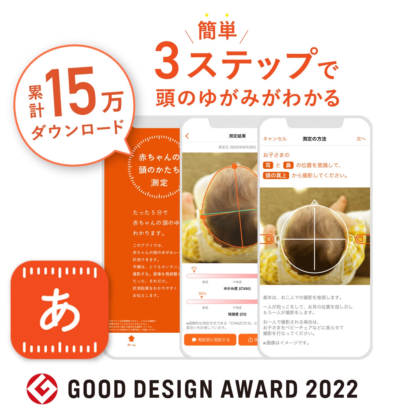無料で使用できる「赤ちゃんの頭のかたち測定アプリ」では、写真を撮るだけで赤ちゃんの頭のかたちを簡単に計測することができます。累計15万ダウンロード(※1)を超えアプリの精度も向上しており、医師の論文発表等にもアプリデータが使用されています。アプリは医師監修の基に作られており、病院の診察の際にも役立てることもできますので、ぜひダウンロードしお役立てください。