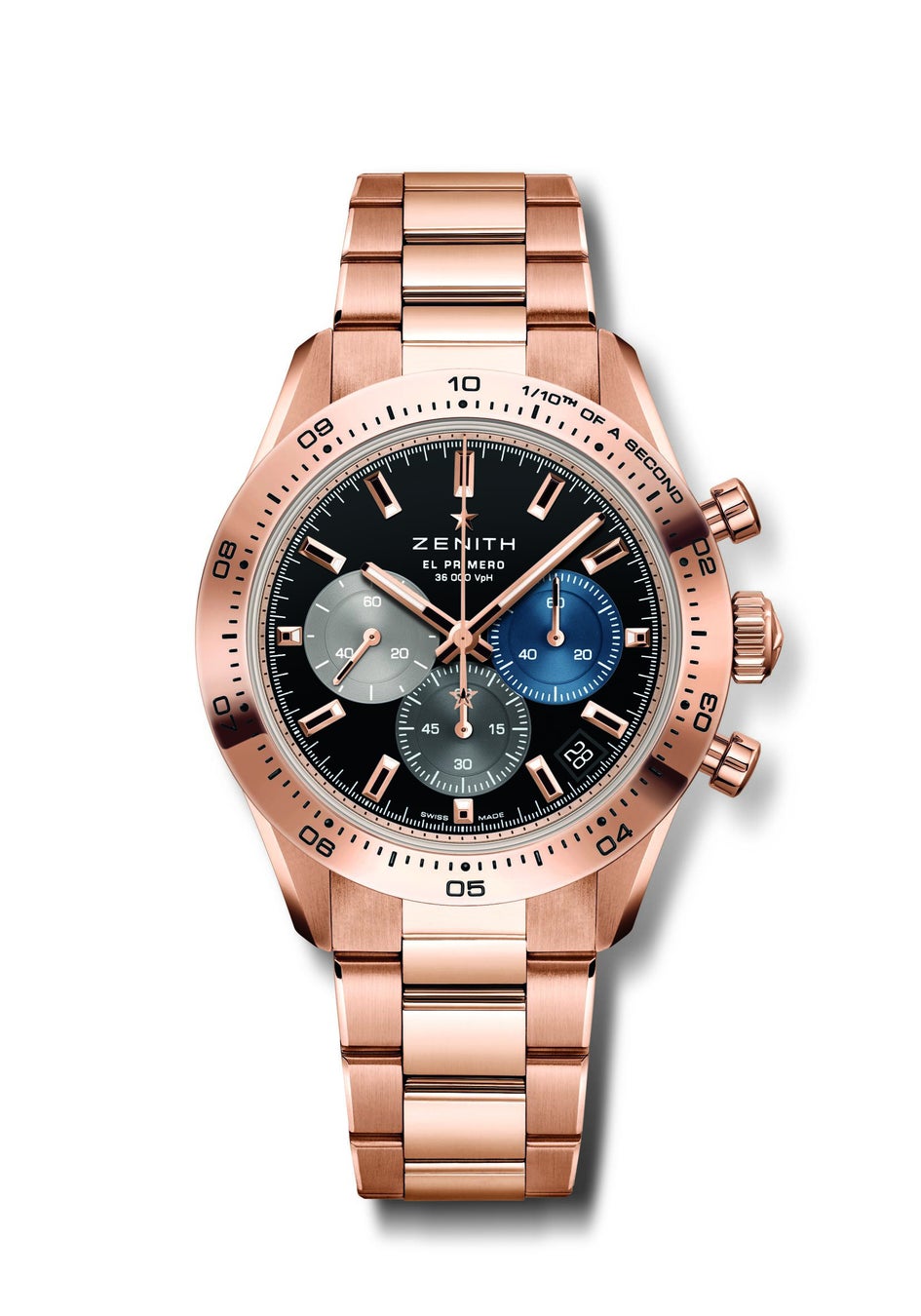 クロノマスター スポーツ ブティックエディションは3色のインカウンターの色に合わせたセラミック製トリコロールカラーのベゼルを採用した特別なモデルです。また、2022年に発表されたローズゴールド製の「クロノマスター スポーツ」は、ゴールドの針とアプライドインデックスを備え、ポンプ型のプッシュボタン、ゴールドブレスレットなど、歴史的なゼニスのクロノグラフの要素を現代的な41mm ローズゴールド製ケースに組み込んでいます。
