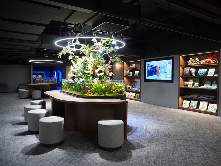「DISCOVERY」は空間中央のシンボル水槽“Ever Greenと、壁面の大きな本棚が印象的。8つのテーマに分類された本棚から自由に本を取り出して読書を楽しんだり、アニメーションキャラクター “オスカル”と、クイズやおみくじなどの双方向コミュニケーションを楽しむことができます。
