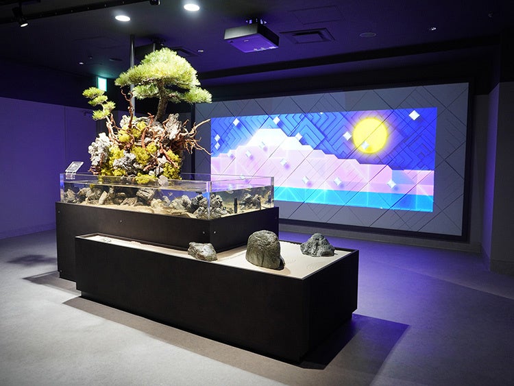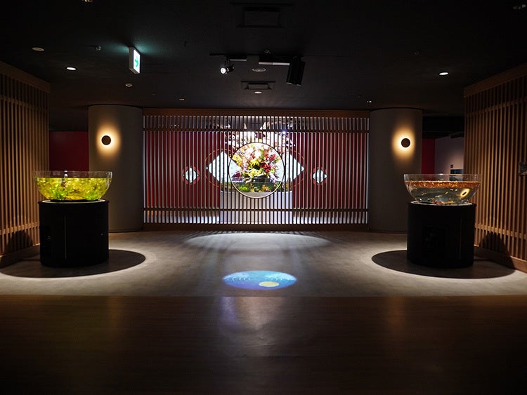 最後のエリア「和む」は、日本特有の美意識や感覚である”わびさび“を表現した和空間になっています。生きものたちのいのちの輝きと、まるで生け花のようなシンボル水槽“春花秋月”、朱塗りの壁に投影された和の情景が見事に調和し、来る人の心を和ませてくれます。