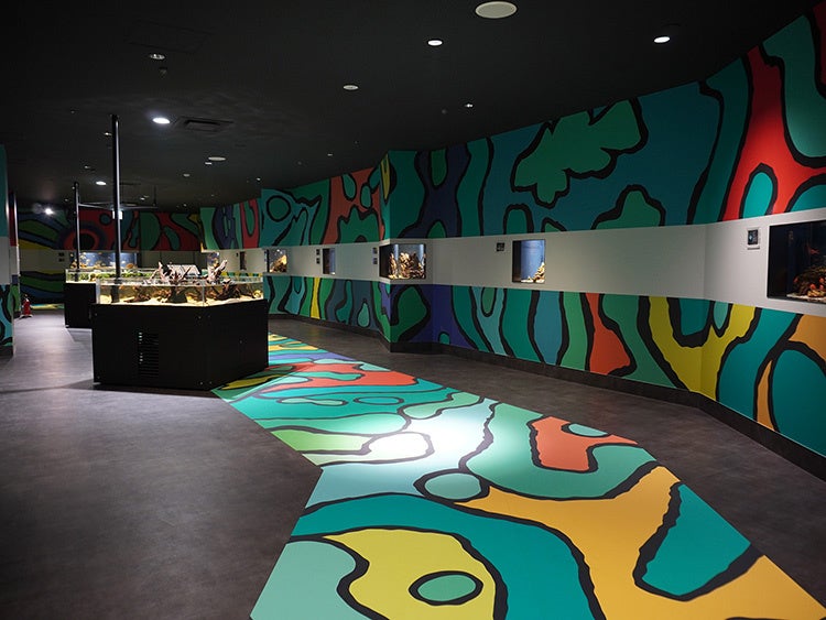 4つ目のエリア“「装う」は床や壁に印象的なニシキテグリの模様を配し、まるでファッションショーのランウェイのよう。ビビットカラーの空間には個性豊かな生きものたちが展示されています。