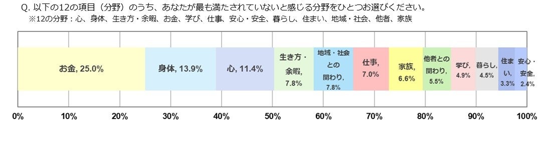 充足度を測る12の分野のうち、生活者が最も満たされていないと感じる分野は、多かった順に「お金」(25.0%)、「身体」(13.9%)、「心」(11.4%)