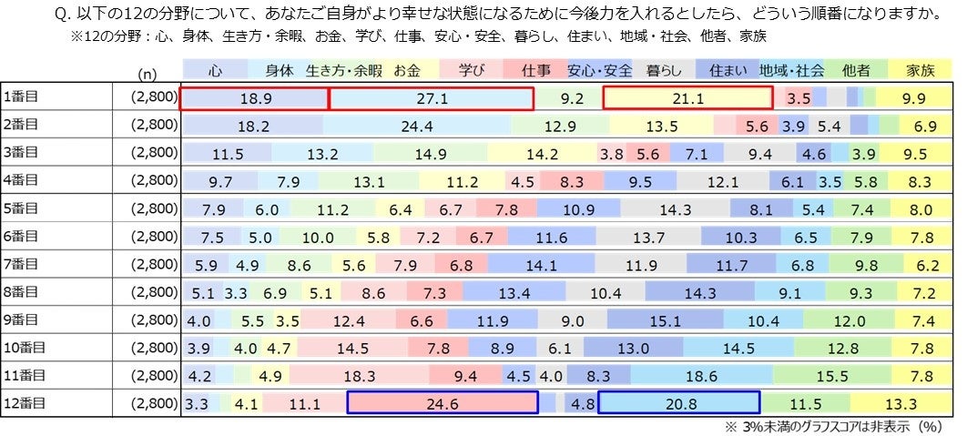 また、12番目で選ばれた項目としては「仕事」(24.6%)や「地域・社会」(20.8%)が多く、前問の満たされていない分野としては中位にありながら、力を入れる優先度としては低いことがわかりました。