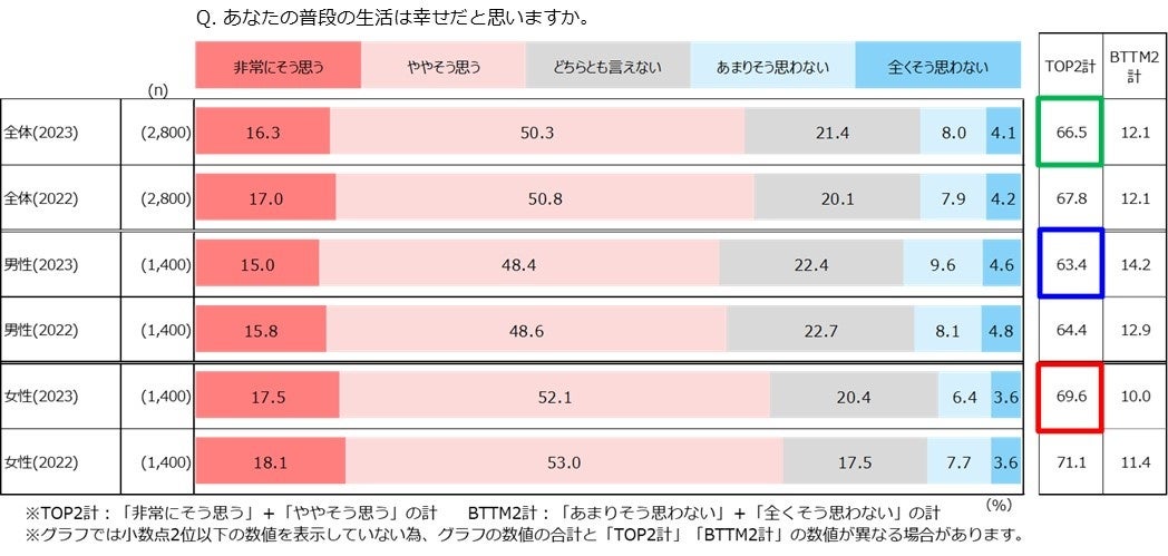 幸福度(「非常にそう思う」+「ややそう思う」の計)は66.5%で、前回調査の67.8%より1.3pt低下しました。男女別では、女性(69.6%)が男性(63.4%)を6.2pt上回っており、前回調査同様、女性の幸福度が男性よりも高い結果となりました。