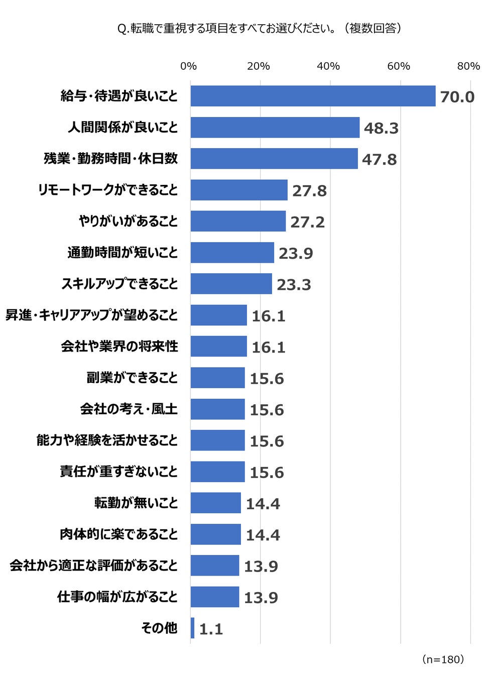 株式会社シナプルリンクが運営するメディア「まるっと転職」(https://synapl.co.jp/career/)は、現在転職を検討している180名を対象に「転職先選びで重要視する項目」に関するアンケート調査を実施致しました。