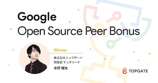 株式会社トップゲート(本社:東京都、代表取締役社長:大塩 啓行、以下「トップゲート」)は、同社エンジニアの水野 瑠太が国際的なオープンソース貢献者を表彰する Google Open Source Peer Bonus を受賞したことを発表いたします。