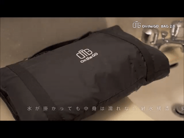 On the GOバッグ2.0は耐水素材でできており、水がかかっても中身は濡れません。安心してバスルームでも使うことができます!