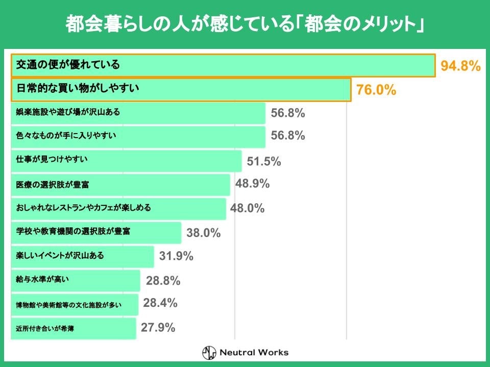 また、都会在住者の感じるメリットでは上位の「交通の便が優れている」と「日常的な買い物がしやすい」の回答数が突出していましたが、地方在住者のメリットとしては上位の回答数に大きな差が無く、複合的な要素でメリットを感じていることが伺えます。