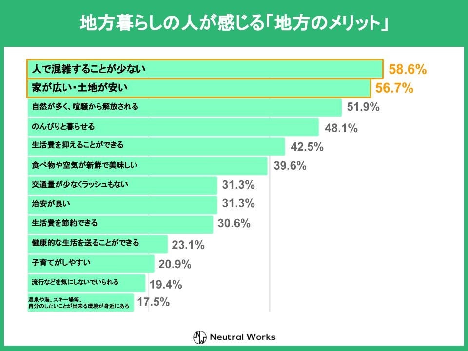 都会在住者が感じているデメリットに対し、ほぼ真逆の結果となっており、のびのびとした環境での暮らしに魅力を感じている方が多いことが分かりました。