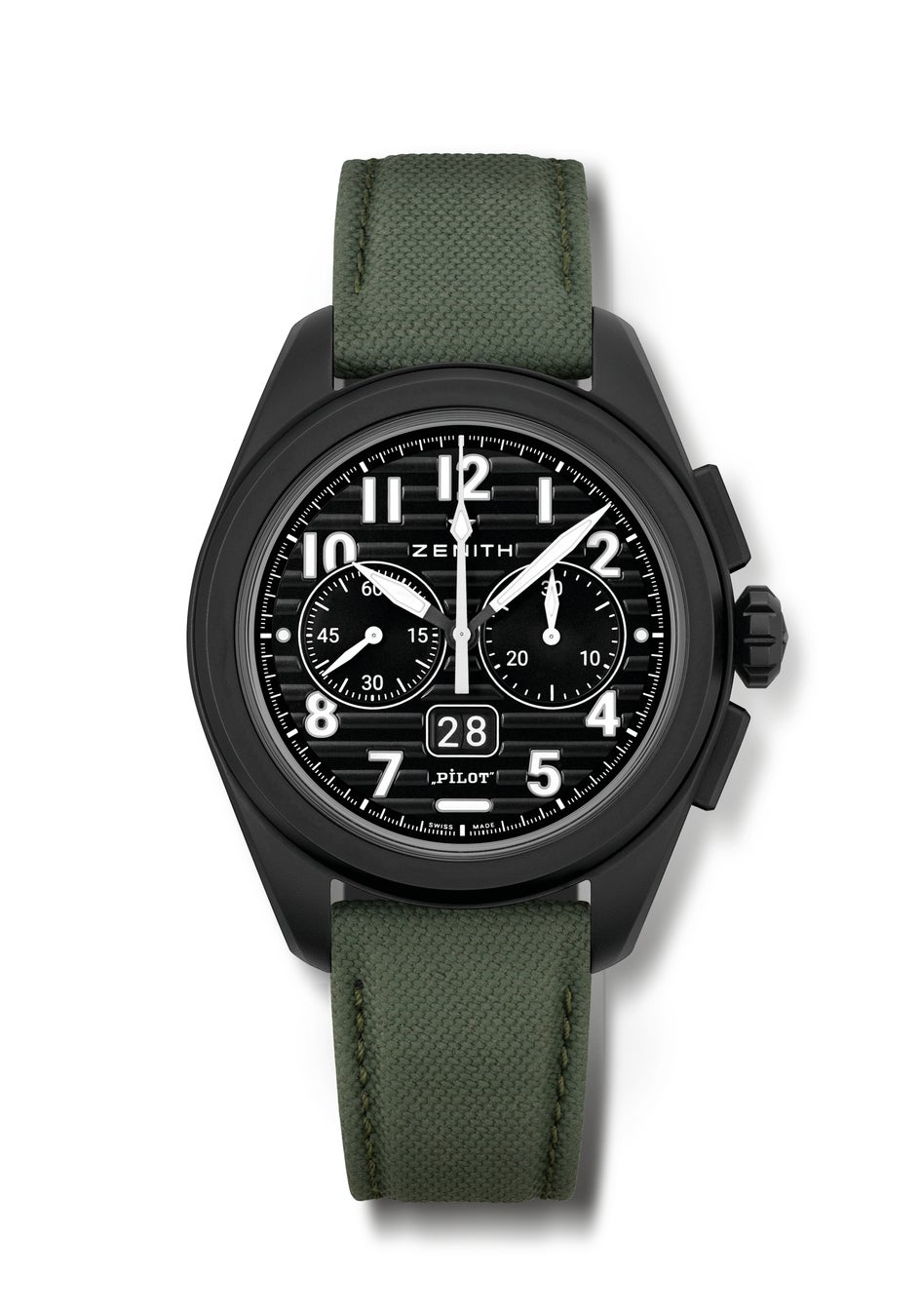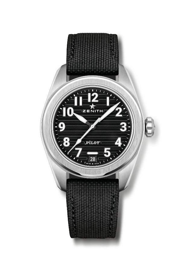 ゼニス パイロットウォッチの新世代モデルであるパイロット オートマティックは、コレクションの美的コードを振り返り、繊細なディテールが溢れる傑出したシルエットを実現しています。40mmのステンレススチール製またはブラックセラミック製ケースに収められたパイロット オートマティックは、全体的に新しいケースデザインが特徴的で、ラウンドケースの上には、固定されたフラットトップ ラウンド型ベゼルが採用されています。スチール製バージョンでは、表面に縦方向のサテンブラッシュド仕上げとポリッシュ仕上げの面取りが施されています。またブラックセラミック製バージョンでは、全体にマイクロブラスト仕上げが施され、さりげないマット仕上げになっています。パイロットウォッチの特徴である大型リューズは、よりモダンで角張ったフォルムとなっていますが、手袋をしたままでも行いやすい操作性はそのままです。