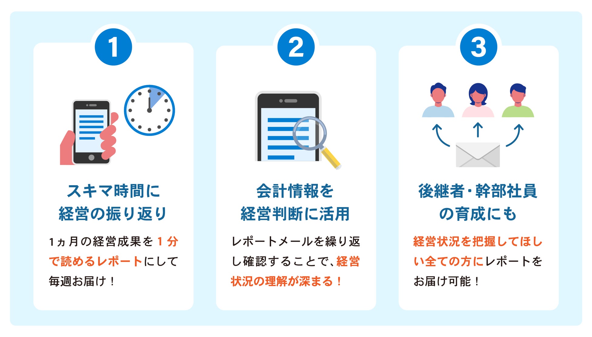 メールを受け取った顧問先はスキマ時間に経営を振り返ることができ、繰り返し経営成果を確認することで経営状況への理解が深まります。また、レポートは複数の方にお送りすることが可能となっており、後継者・幹部社員の育成にもお役立ていただけます。