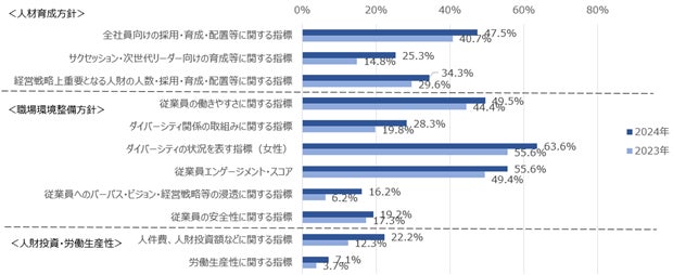 人的資本に関する指標で開示企業が多かった上位項目は、「ダイバーシティの状況を表す指標(女性)」「従業員エンゲージメント」「全社員向けの採用・育成・配置等に関する指標」「働きやすさに関する指標」となり、昨年からこの傾向は大きく変わらず、開示割合もそれぞれ約5ptから8pt開示割合が上昇しています。また、開示割合の上昇率が高い項目としては、「サクセッション・次世代リーダー向けの育成等に関する指標」、「従業員へのパーパス・ビジョン・経営戦略等の浸透に関する指標」、「人件費、人財投資額などに関する指標」となり、昨年から約10pt上昇しています。一方で、戦略で記述が増加していた経営戦略上重要な人財の採用・育成等の取組みに関する指標である「経営戦略上重要となる人財の人数・採用・育成・配置等に関する指標」は、4.7pt増と、戦略の記述の増加に対して、指標の開示の増加は小幅にとどまりました。