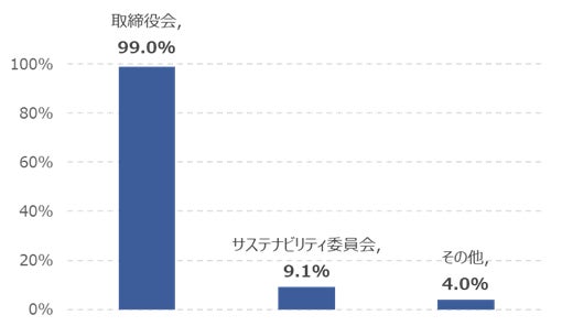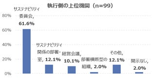 サステナビリティ情報の記載欄における「ガバナンス」の記載をみると、サステナビリティの諸課題に対して「取締役会」が監督する旨を開示する企業は99.0%であった。また、サステナビリティ関連の取組みを管理する執行機関としては、61.6%の企業が「サステナビリティ委員会」を設置している旨を開示している。