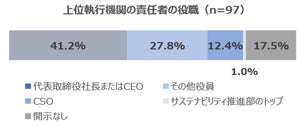 サステナビリティに関連する取組みを管理する執行体制において、61.6%の企業が主要な執行機関として「サステナビリティ委員会」を設置していました(図表3)。上位の執行機関のトップは「代表取締役またはCEO」が41.2%と最も多く、27.8%の企業がサステナビリティ担当役員・取締役を含む「その他役員」を配置しているという結果となります。続いて「CSO」(Chief Sustainability Officer)を設置している企業は12.4%となり、「その他役員」を執行機関のトップに据えている企業を含めると、代表取締役社長以外にサステナビリティの取組みに関する管理責任を委任し担当の役員を任命している企業が約4割にのぼります。