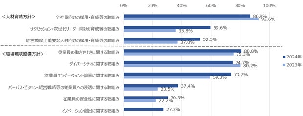 人的資本の戦略における人材育成方針や社内環境整備方針の具体的取組みの記載状況をみると、全体的に記述の充実がみられました。人材育成方針については、「全社員向けの採用・育成等の取組み」に関する記述が2023年に引き続き最も多くの企業で開示されているのに加えて、2024年では、「サクセッション・次世代リーダー向けの育成等の取組み」、「経営戦略上重要な人財向けの人財の採用・育成等の取組み」に関する記述を行う企業がそれぞれ59.6%、52.5%と、昨年の30%台から大きく増加しました。社内環境整備方針についてみると、「従業員の働きやすさに関する取組み」や「ダイバーシティに関する取組み」に続き、「従業員エンゲージメントに関する取組み」の記述も昨年から14.4pt増加し、73.7%と多くの企業で取り組まれていることがわかりました。