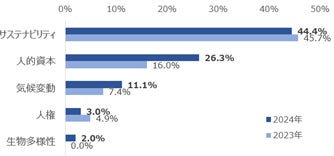 取締役会の具体的な検討内容において、「サステナビリティ」について記載する企業の割合は、昨年比で横ばいの44.4%であった。一方、個別テーマである「人的資本」について記載する企業は26.3%と昨年の約1.6倍となっており、「気候変動」や「生物多様性」について記載する企業も増加している。