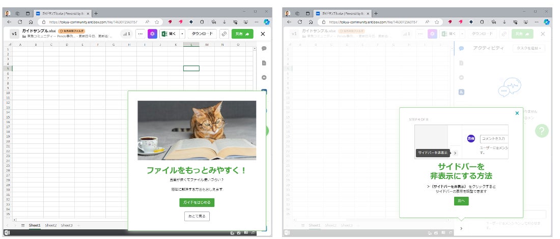 同社はBoxの操作性を向上させる必要があると感じている社員の利用状況についてPendoを用いてデータで分析しました。その結果例えば、「サイドバーを非表示にする」機能が、半数以上の社員に活用されていないことが判明しました。このように数値化された気づきを基にPendoのガイド機能を設定すると、90%以上のユーザーの目に留まり、Boxの同機能の利用率が右肩上がりで向上しました。従来、全社向けに配布していたマニュアルのアクセス率が10%にも満たなかったことを踏まえると、これは大きな飛躍です。
