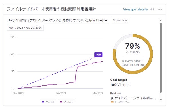 (画像2)Pendo管理画面上での効果測定。2023年11月からの累計利用者数を示しており、ガイド展開後に利用率が飛躍。8割という高い利用率で定着している。
