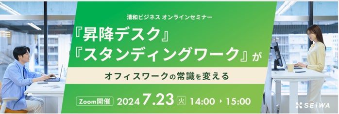 株式会社清和ビジネス(本社:東京都中央区 代表取締役:勝本 浩史)は、2024年7月23日(火)に企業の経営者、総務・人事担当者を対象にオンラインセミナーを開催いたします。今回のセミナーでは『昇降デスク』『スタンディングワーク』がオフィスの常識を変えると題して、清和ビジネスが約10年にわたり実証実験を行う電動式昇降デスクを利用したスタンディングワークについて、その導入効果と昇降デスクの活用方法をご案内いたします。