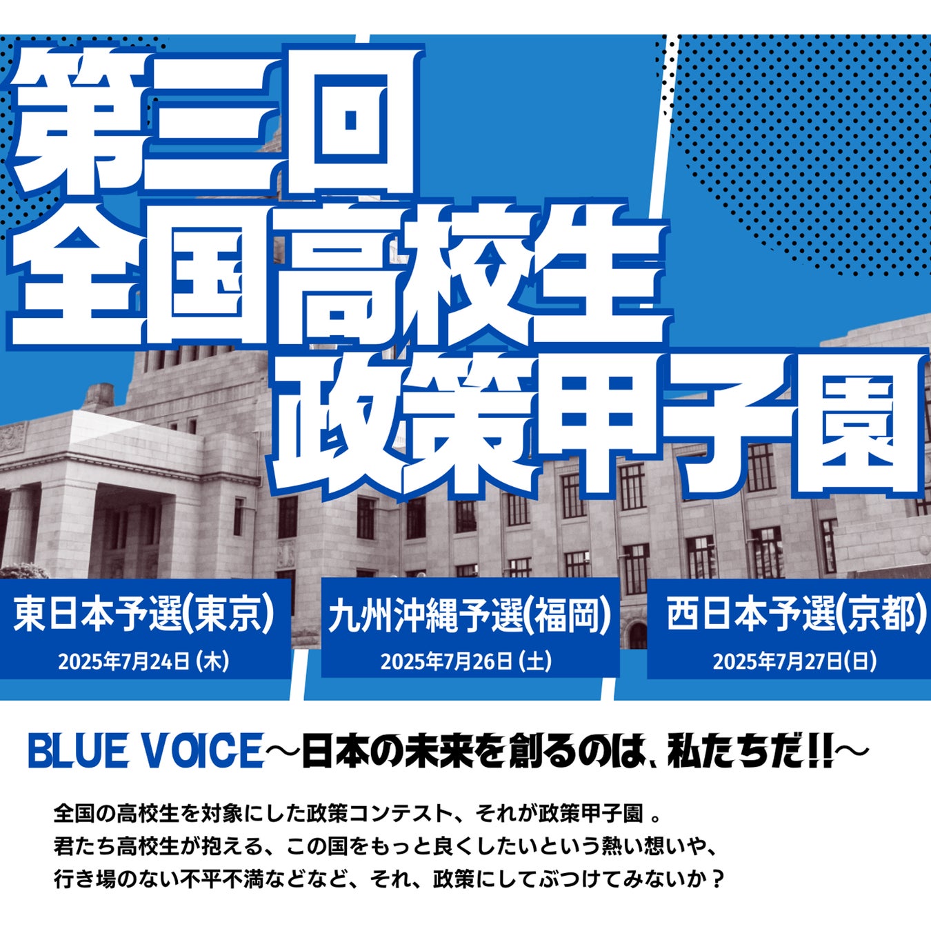 第三回全国高校生政策甲子園への参加エントリーの締め切りは、2025年6月15日(日)です。エントリー方法はこちらの動画(第三回政策甲子園エントリー方法)でもご紹介しているので、ぜひご覧ください。また、エントリー後、書類審査を通過すると、各地地区予選が東京都庁(7月24日(木):東日本地区予選大会)、糸島市議会場(7月26日(土):九州沖縄地区予選大会)、京都府議会旧議場(7月27日(日):西日本地区予選大会)で行われます。参加エントリーはまだまだ受け付けておりますので、全国の高校生からのご応募を心よりお待ちしております。