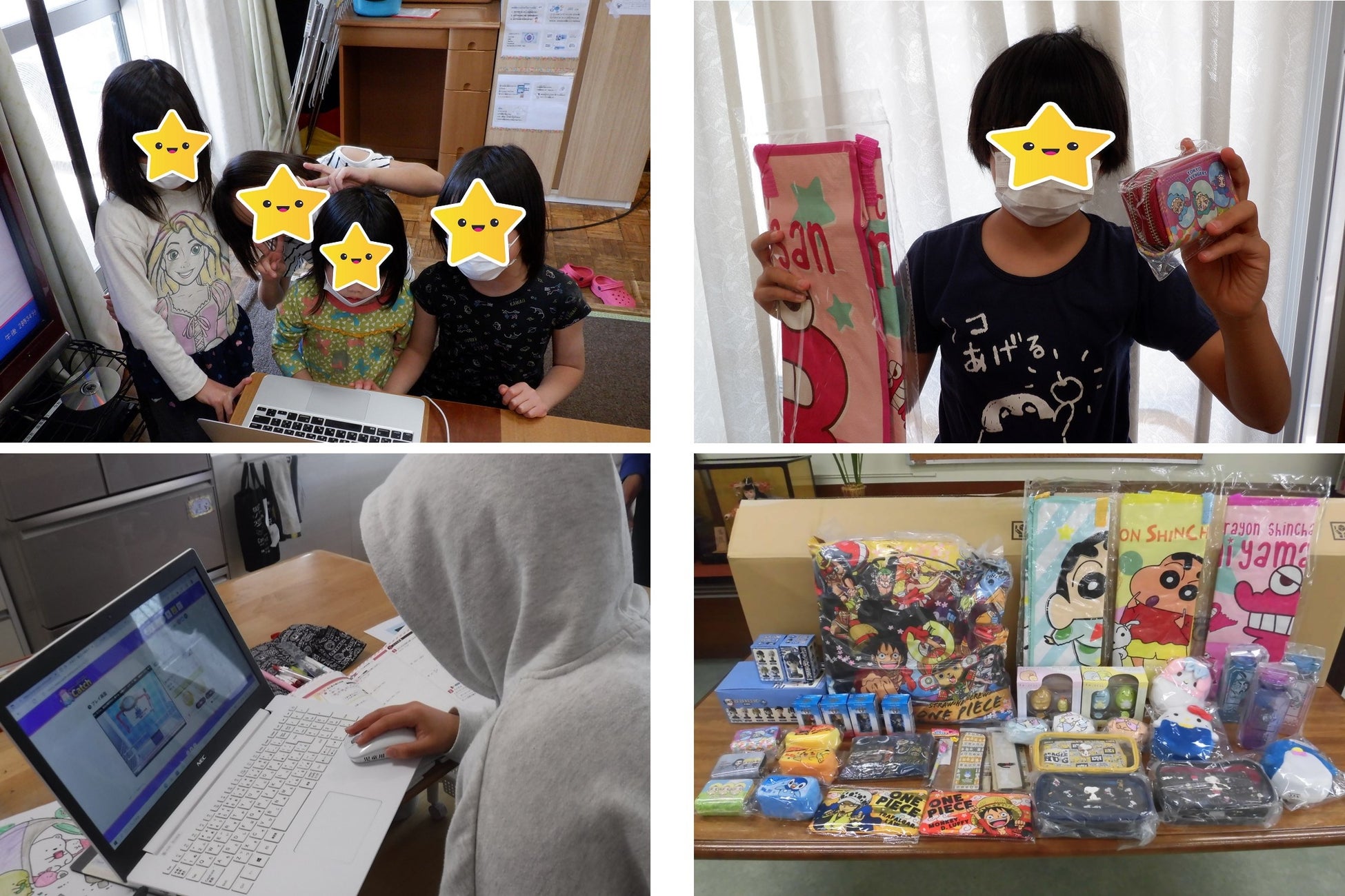 海の子学園入舟寮の皆さまにご提供。獲得商品は、人気キャラクターグッズや筆記用具など。
