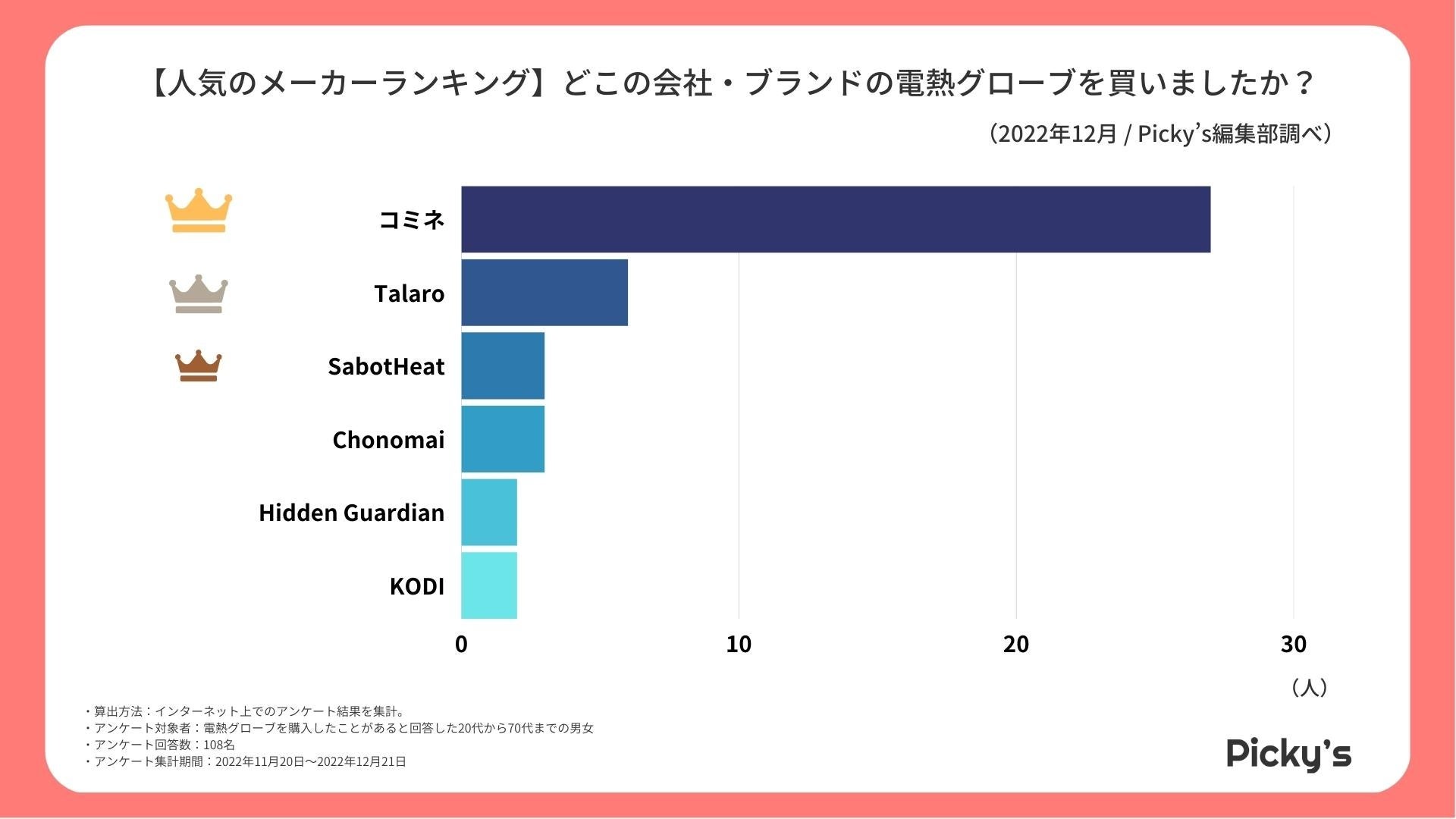 「Picky’s」は、インターネットショッピングにおいて、購入前に試せない・選ぶべきものがわからないという課題の解決を目標に、あらゆる商品のおすすめランキングや検証レビューを紹介するサイトです。このたびPicky’s(https://rentry.jp/note/)では、電熱グローブを買う際に意識していることや人気のメーカー・ブランドなどをインターネット上でアンケート調査を行い、ランキングを作成いたしましたので発表いたします。
