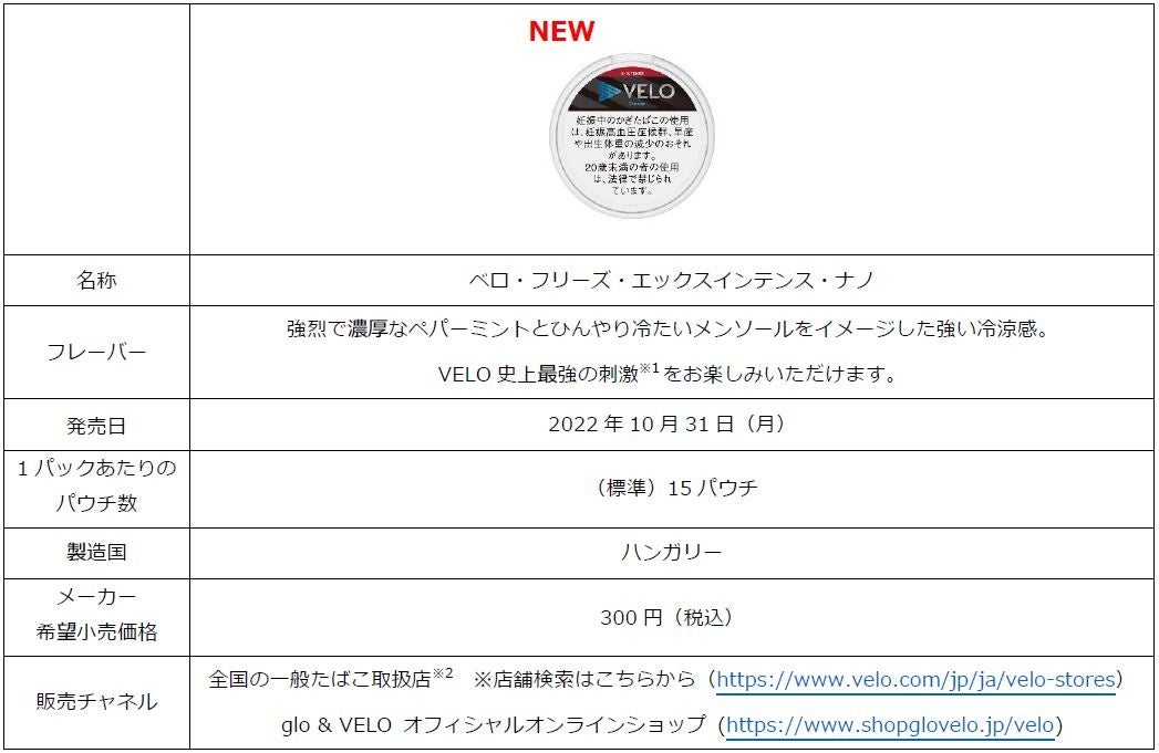 ブリティッシュ・アメリカン・タバコ・ジャパン(本社:東京都港区赤坂、社長:ジェームズ 山中、以下「BATジャパン」)は、歯茎と頬の間に挟んで楽しむ純白パウチのオーラルたばこ「VELO(ベロ)」ブランドから、VELO史上最強の刺激(※1)を楽しめるフレーバー「ベロ・フリーズ・エックスインテンス・ナノ」を本年10月31日(月)より全国の一般たばこ取扱店(※3)及びglo & VELO オフィシャルオンラインショップで販売を開始します。