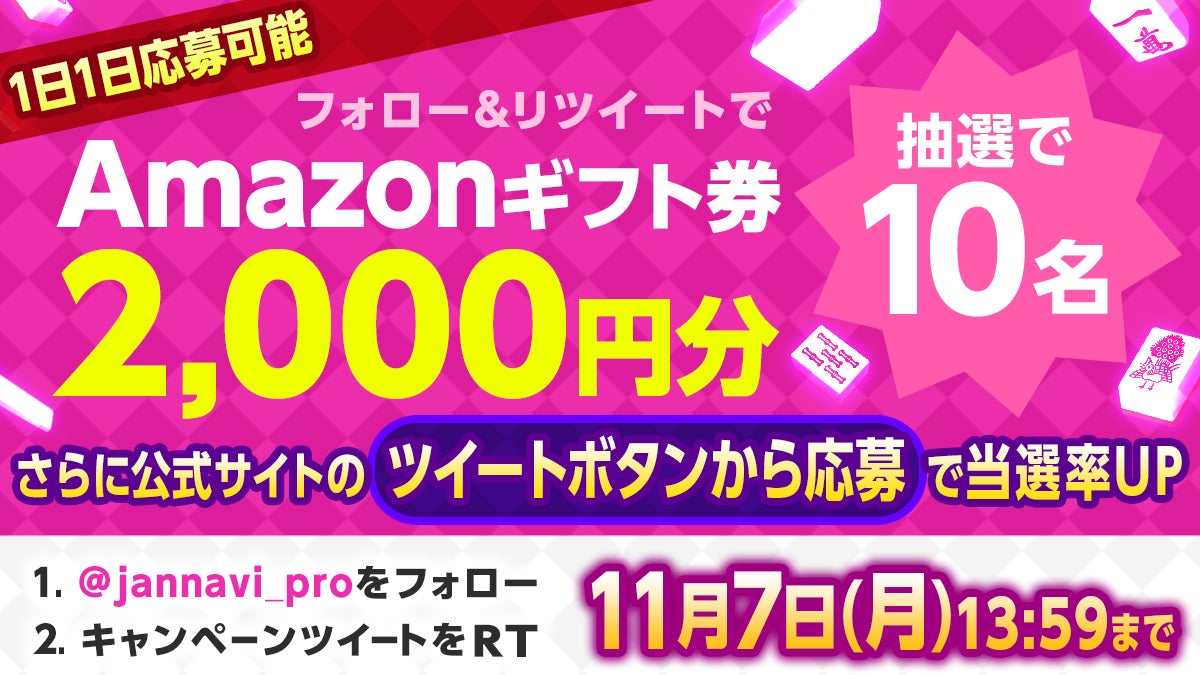 「ジャンナビ麻雀オンライン」amazonギフト2000円分が当たるTwitterキャンペーン開催