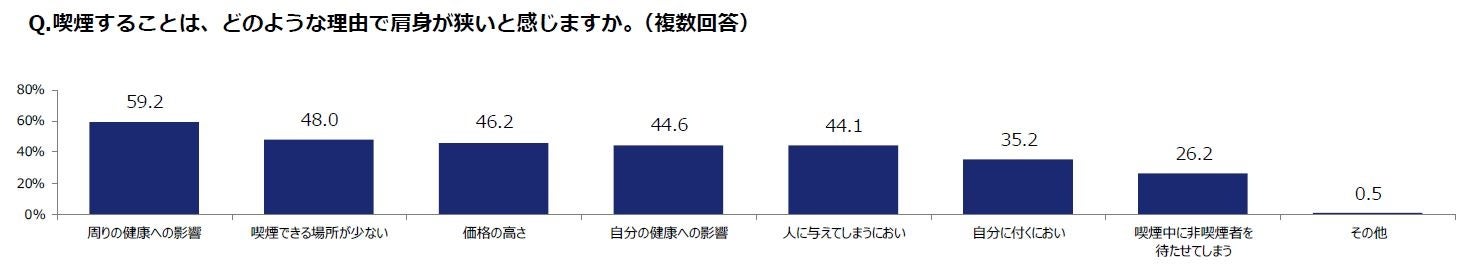 喫煙者(紙巻・加熱式)の88.3%が、喫煙することで「肩身が狭い」と回答しており、その理由として「周囲の健康への影響(59.2%)」や「人に与えてしまうニオイ(44.1%)」、「喫煙中に非喫煙者を待たせてしまう (26.2%)」など、非喫煙者を気遣う故に「肩身が狭い」と感じていることが明らかになりました。また、「喫煙できる場所が少ないこと(48.0%)」も「肩身が狭い」と感じる大きな要因であることが明らかになりました。