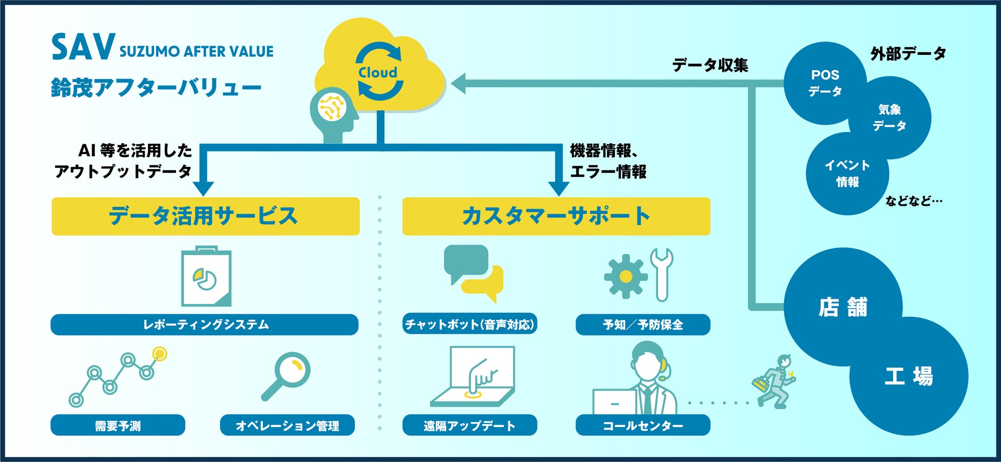 SAV(Suzumo After Value)はお客様が使用している当社機械から稼働状況や機械状態といったデータを収集し、機械の予知保全や需要予測、店舗運営のサポート等に活かす、IoT技術を活用した新たな価値を創出するサービス構想です。