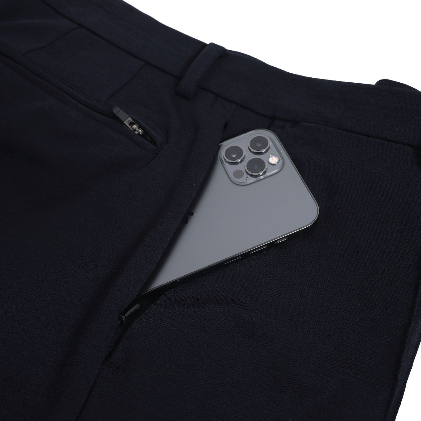 「スリムテーパード・トラベルスラックス」と同様に、左右のヒップにはファスナー付きポケット、フロントには