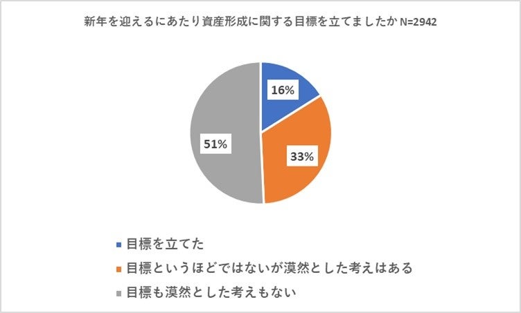 新年を迎えるにあたり資産形成の目標を立てなかった人が51パーセントとなりました。資産運用は「毎月いくら積み立てる」などのように最初に決めておくことが大切です。行き当たりばったりでは上手くいきません。節目のタイミングでは収支やポートフォリオを見直し、具体的な計画を立てると良いでしょう。