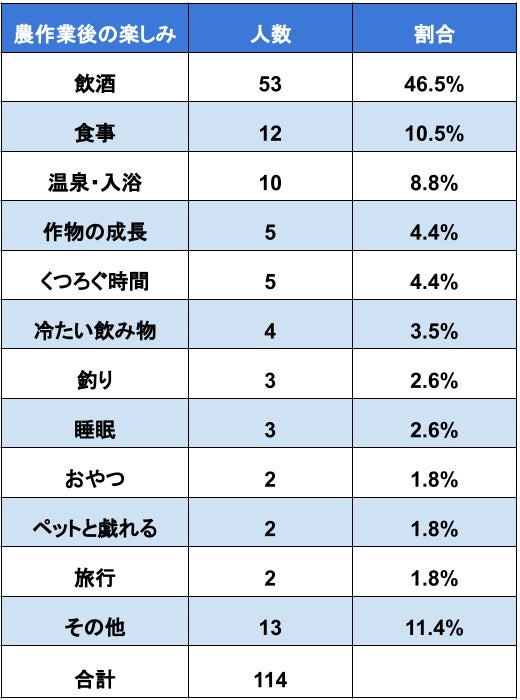 「農作業を終えた後に楽しみにしていることは何ですか?」(n=114)と質問したところ、「飲酒」と回答した人が最も多く全体の46.5%、次いで「食事」が10.5%を占めました。