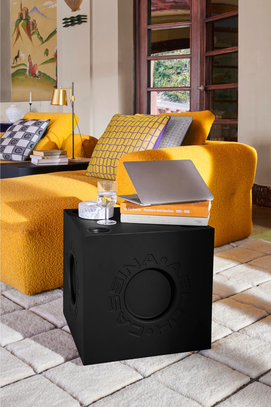 2つのサイズのブロックは硬質でインダストリアルな外観をもちながら、手触りはソフトでやや弾力があり、シートとしてもサイドテーブルとしても使用可能です。オレンジ色の円筒形のパーツをユニットの間にはめ込むことで連結し、ブロックのように並べたり重ねたりすることでオットマン、ベンチ、テーブルなどができあがります。