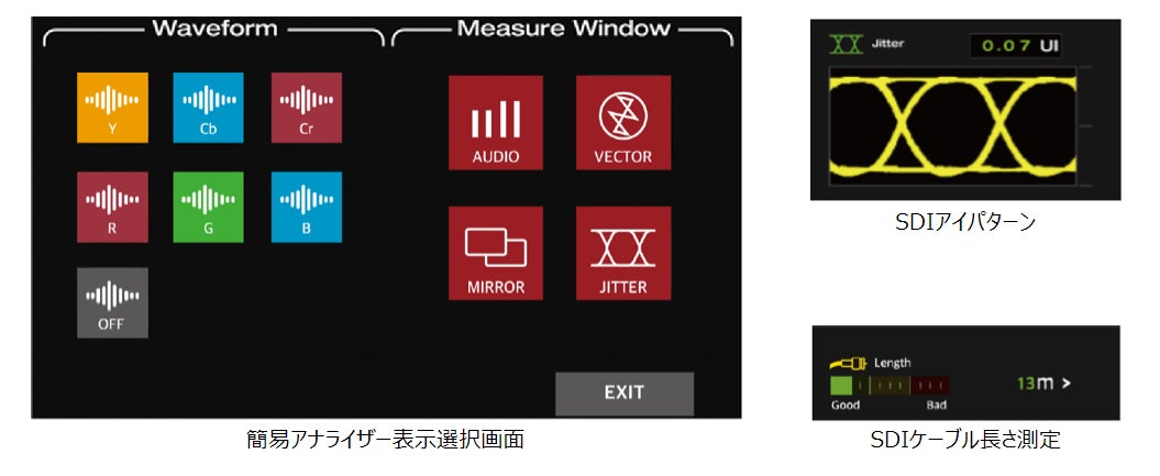 簡易アナライザ機能搭載(ウェーブフォーム、ベクトルスコープ、SDIアイパターン、SDIケーブル長、オーディオレベル)